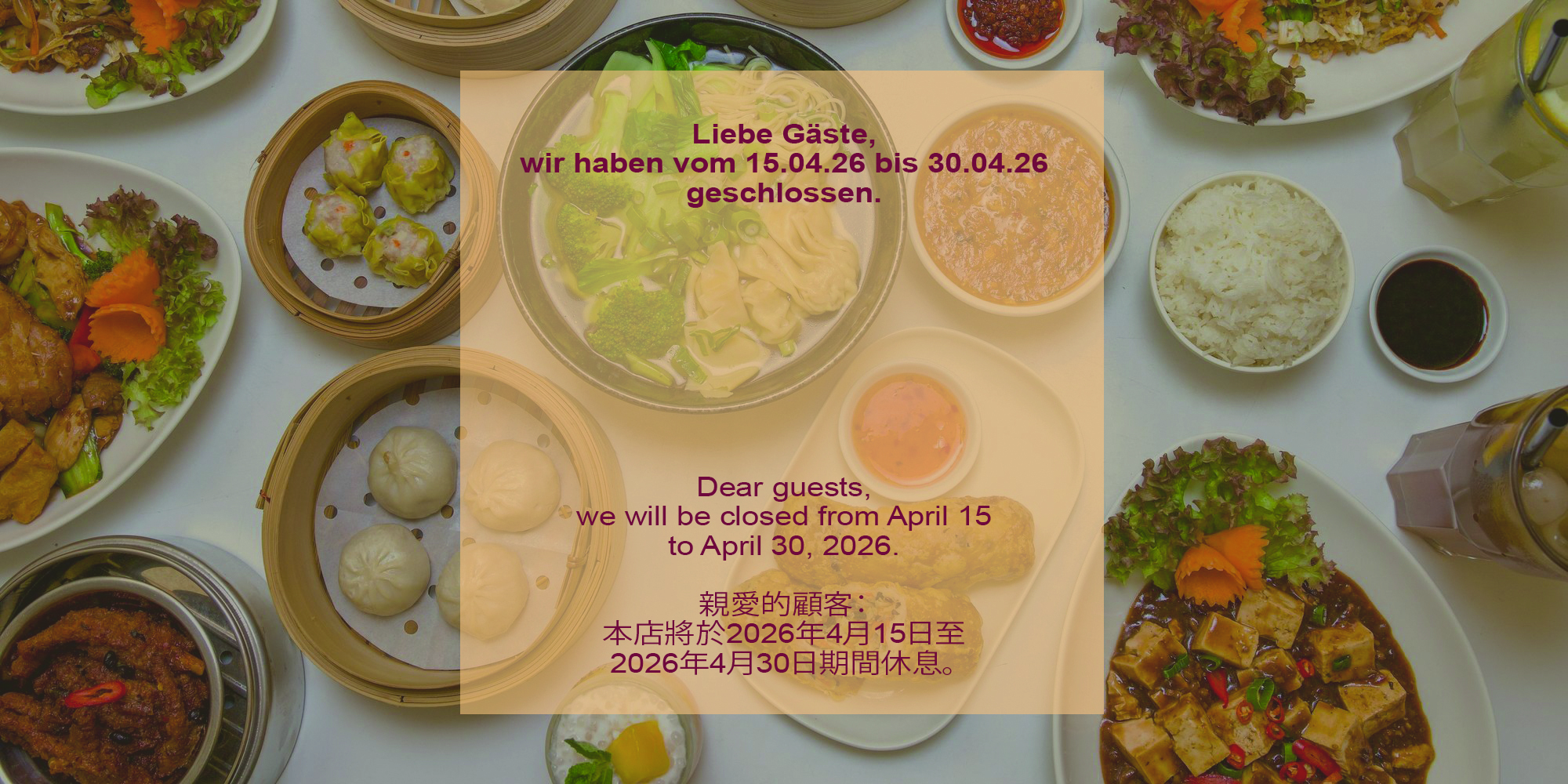 KONTAKT: Tel: 030 586 007 66 ADRESSE: Motzstr. 58 10777 Berlin ÖFFNUNGSZEITEN: Montag: Ruhetag Di. - Sa.: 17:00 - 22:00 Uhr Sonntag.: 12:00 - 22:00 Uhr Restaurant Guru 2020Das beste Chinesisches RestaurantsGOJI